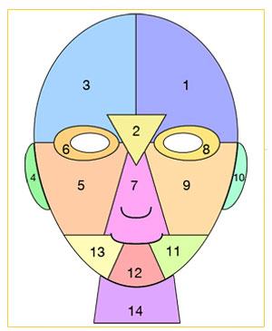 โซนที่ 6 และโซนที่ 8 ตำแหน่งรอบดวงตาทั้ง 2 ข้าง เกี่ยวข้องกับไต และปัญหาภูมิแพ้ สาเหตุมาจากเครื่องสำอางที่ใช้อยู่ อาจไม่เหมาะสม หรือใส่แว่นตาที่เสียดสีมาก รอยคล้ำอาจเกิดจากการมีสารพิษตกค้างในร่างกายมาก หรือพักผ่อนน้อย เปลือกตาหากมีความระคายเคือง อาจมาจากการเป็นภูมิแพ้ หรือขาดสารอาหาร